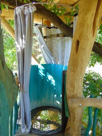Ów domek na drzewie posiada własne WC oraz prysznic z (jeszcze) zimną wodą.
